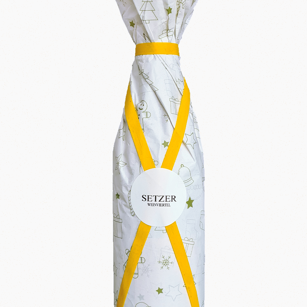 Mit unserer hochwertigen Verpackung wird eine einzelne Flasche zu einem schönen Präsent! Uli SETZER lässt ihre Verpackungskünste persönlich spielen und zaubert aus weihnachtlichen Wickelpapier und einem Baumwollband eine Verpackung, die jede Flasche strahlen lässt.